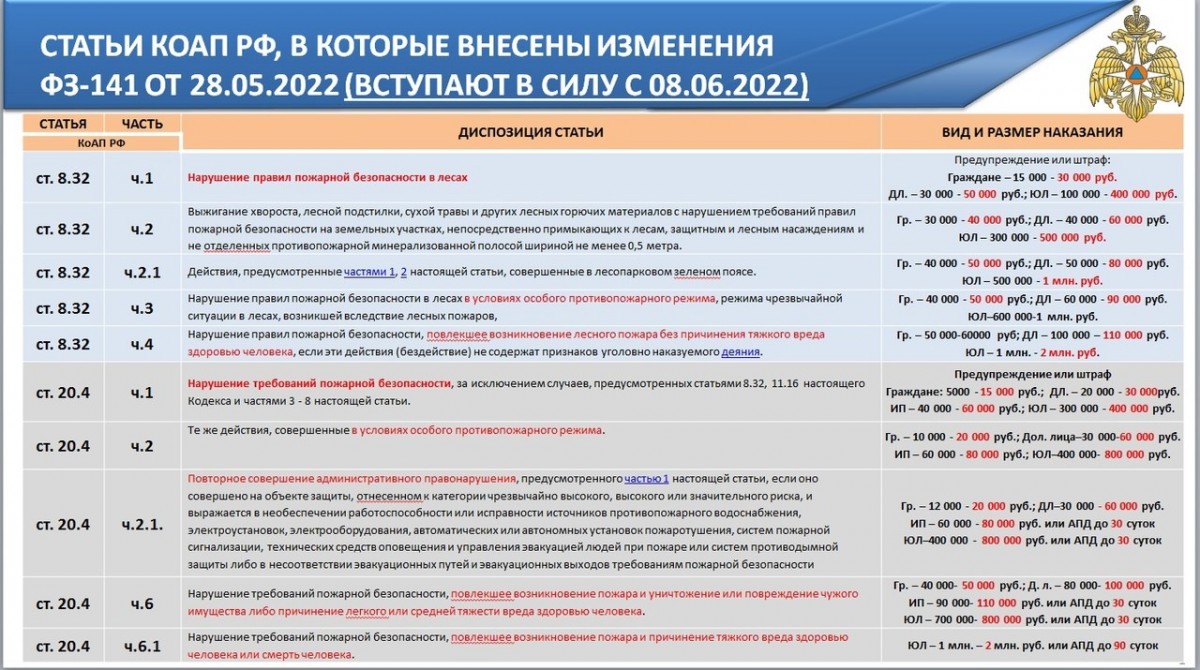 В соответствии с Федеральным законом от 28.05.2022 № 141-ФЗ вносятся изменения в статью 20.4 КоАП РФ «Нарушение требований пожарной безопасности» и статью 8.32 КоАП РФ «Нарушение правил пожарной безопасности в лесах».