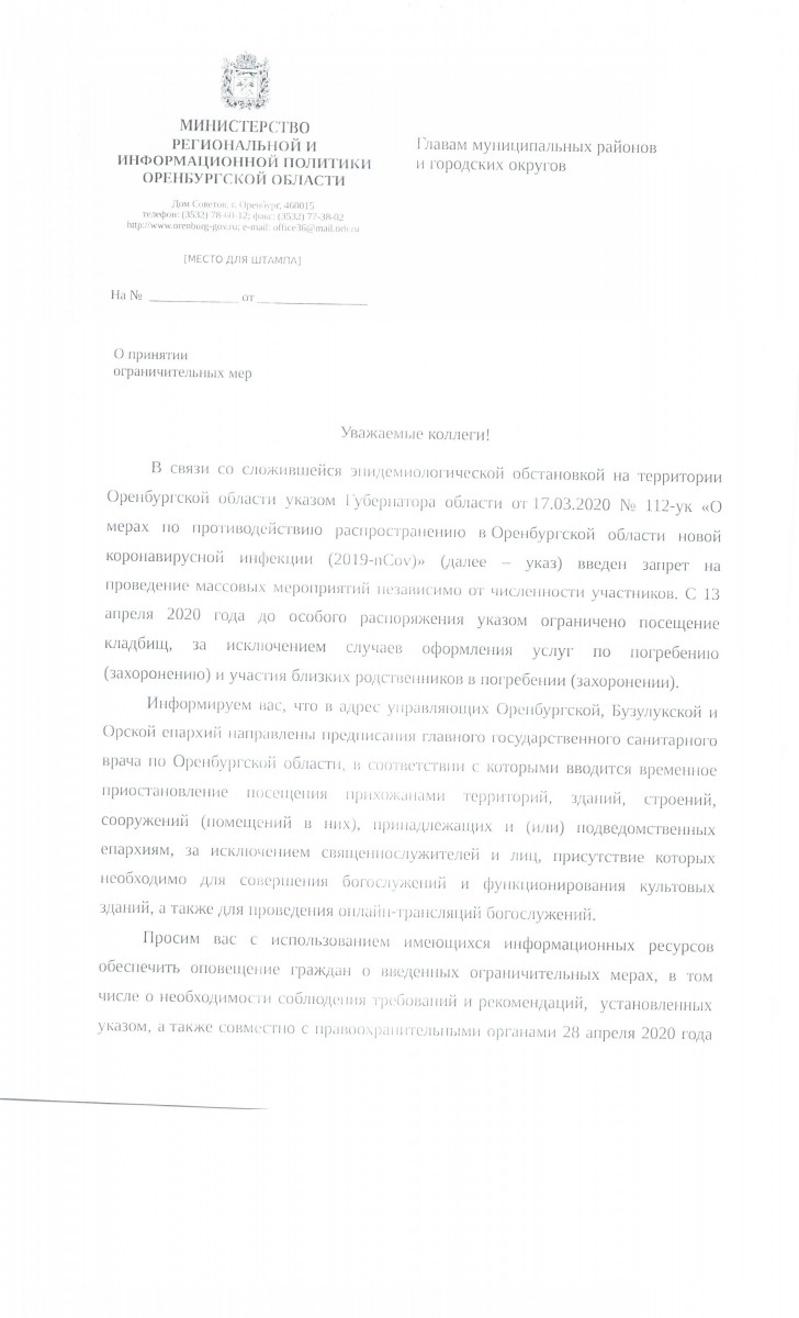 Главная / Новости / Информация министерства региональной и информационной политики Оренбургской области «О принятии ограничительных мер»